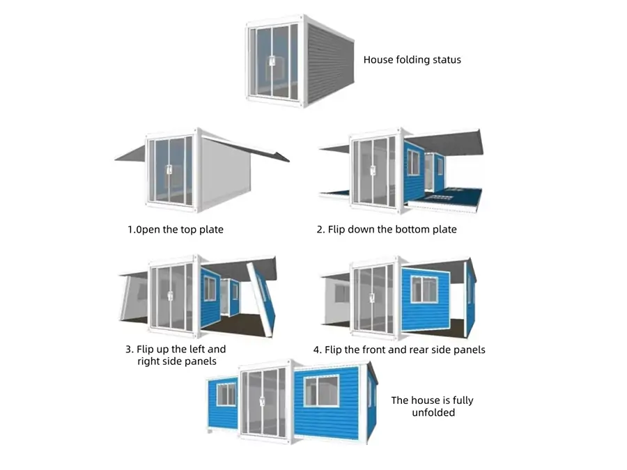 The Expandable Container House is a prefabricated fold-out structure designed for fast installation and easy transportation. It comes as a compact unit with pre-installed electrical and plumbing systems.